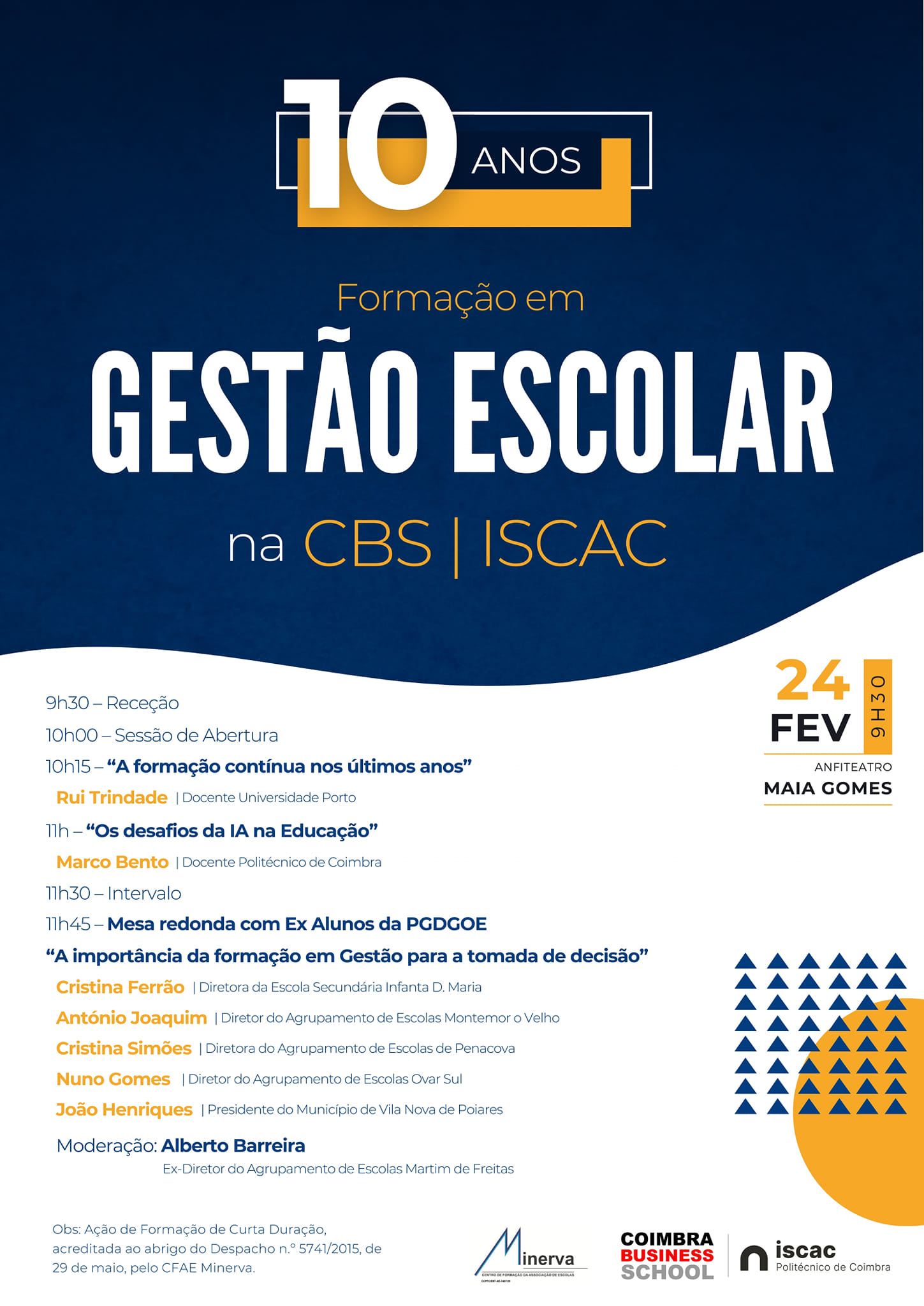 No âmbito da parceria do CFAE Minerva e a Coimbra Buisiness School - ISCAC, na Comemoração dos 10 anos de Formação em Gestão Escolar, será realizada uma Ação de Formação de Curta Duração sobre a temática "A importância da Formação em Gestão Escolar para as tomadas de decisões"